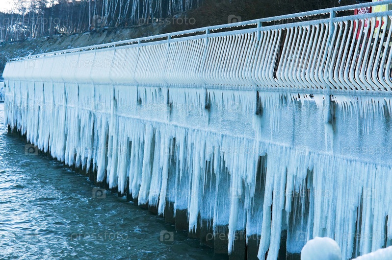 Металлический забор покрылся льдом, зима на Балтийском море, наледь на набережной, причал во льду