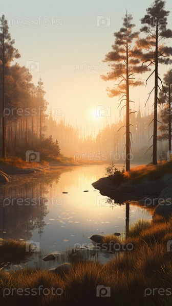 Красочная иллюстрация с пейзажем лесного озера