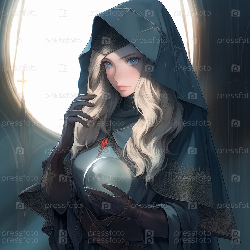 Красивая седовласая девушка с голубыми глазами держит в руках хрустальный шар. В стиле аниме