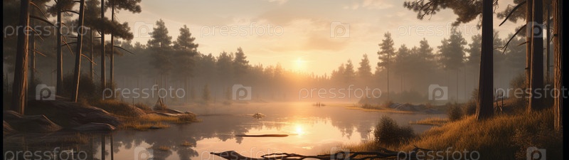 Красочная иллюстрация с пейзажем лесного озера