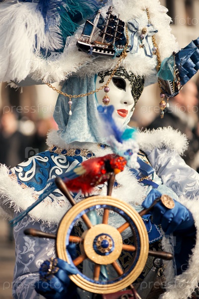 Женщина в карнавальном костюме с рулем и красным попугаем