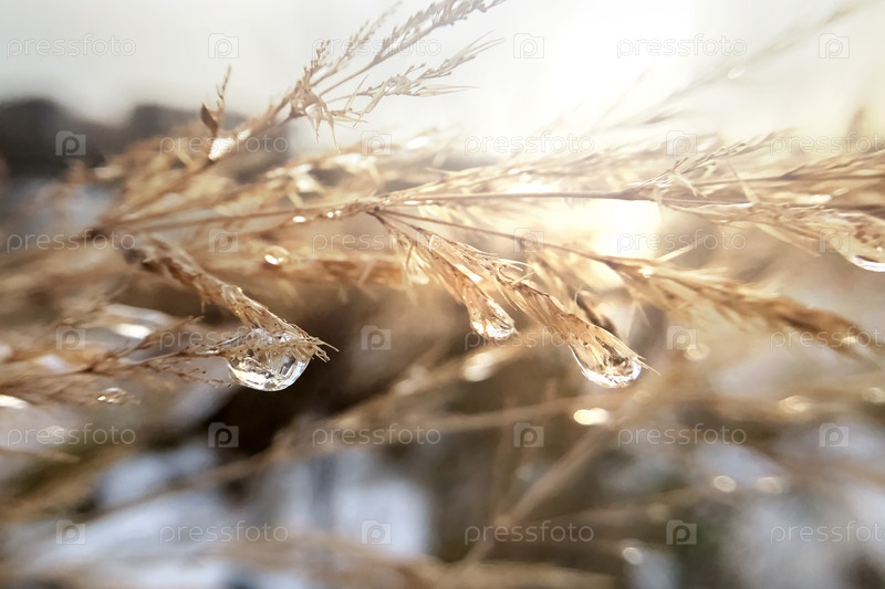 Замороженные кристаллы воды на сухой траве на фоне солнечного света