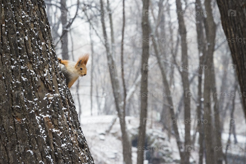 Белка растягивается на дереве в зимнем лесу