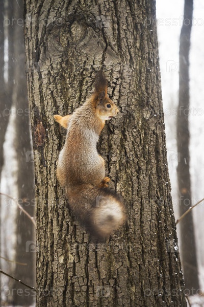 Белка растягивается на дереве в зимнем лесу