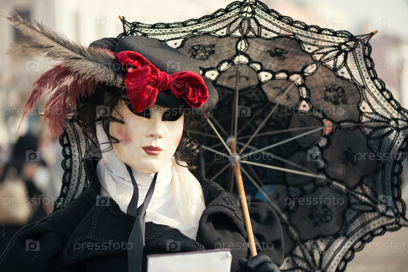 Женщина в костюме венецианского карнавала с черным зонтиком