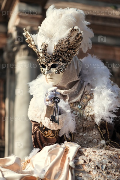Женщина в карнавальном костюме позирует на улице Венеции, Италия