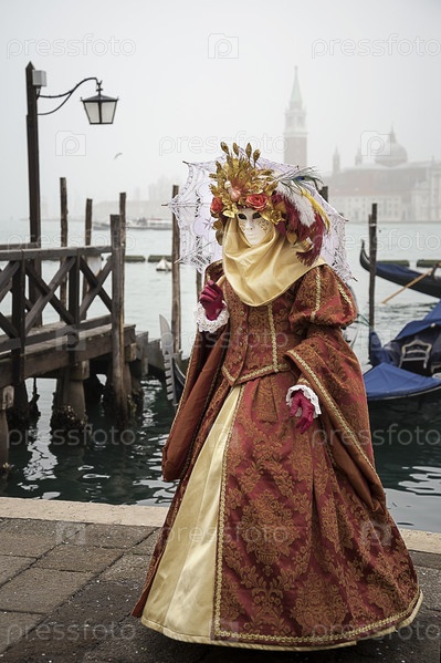 Женщина в костюме венецианского карнавала на фоне лагуны