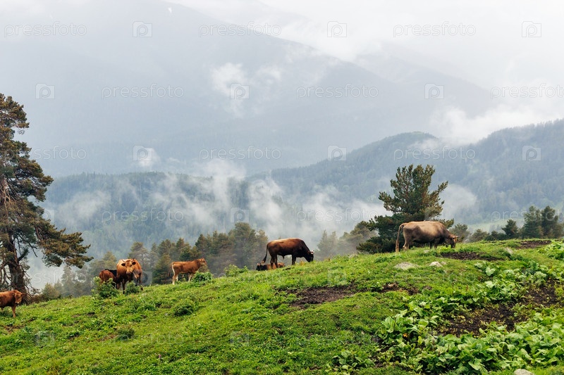 Коровы на лугу в высокогорье в туманный день