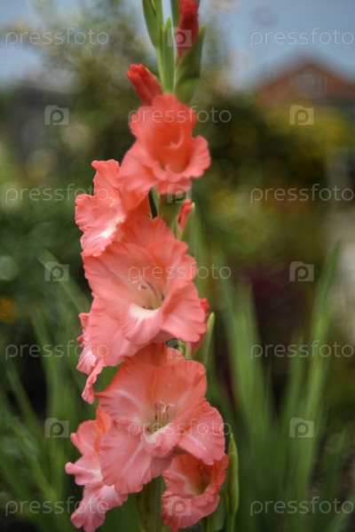 Красные гладиолусы в летнем саду. Красный букет цветов. Красивое размытие фона. ирисовые