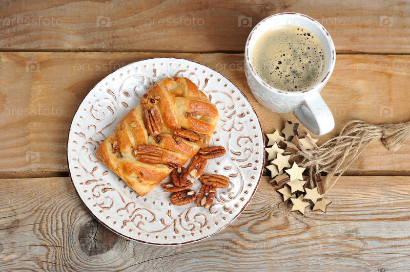 Булочка с пеканом и кофе