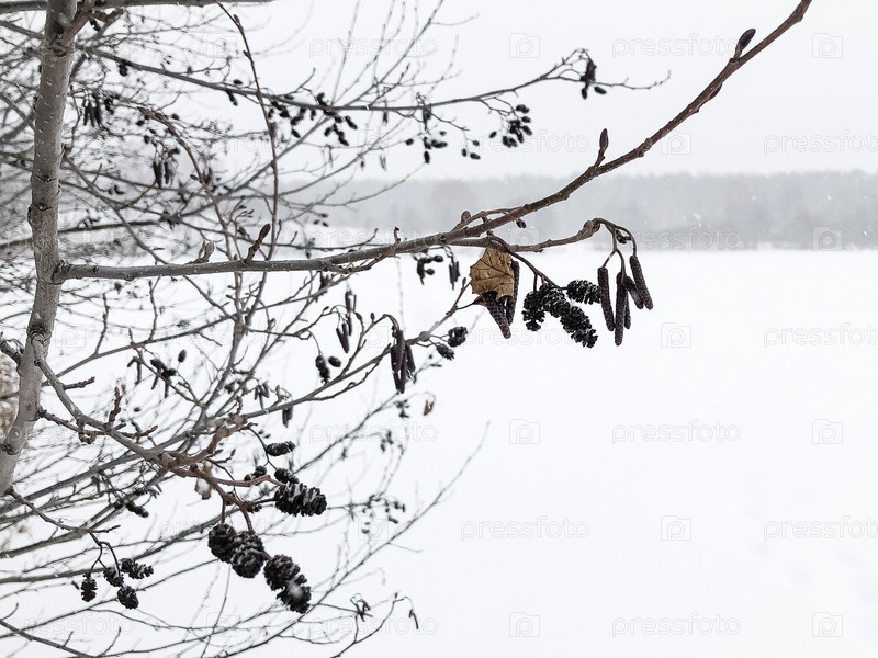 Сухие ольховые сережки на ветке дерева зимой крупным планом
