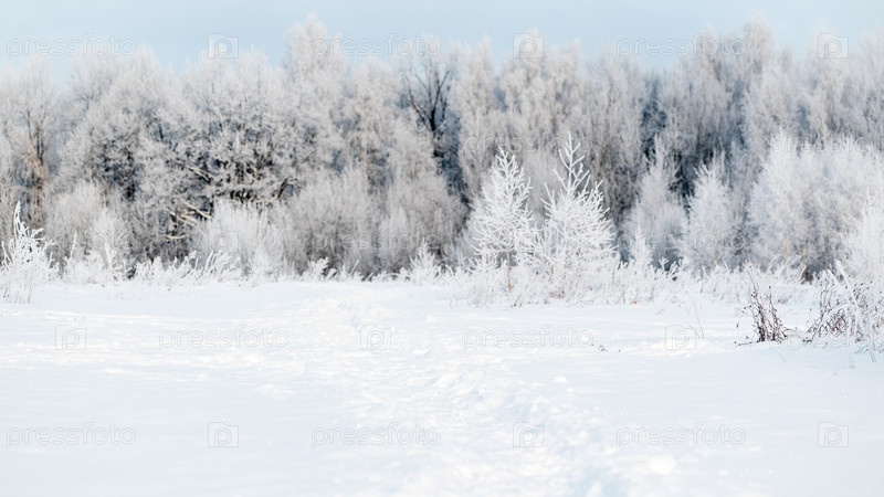 Деревья зимнего леса, покрытые белым инеем в морозный день