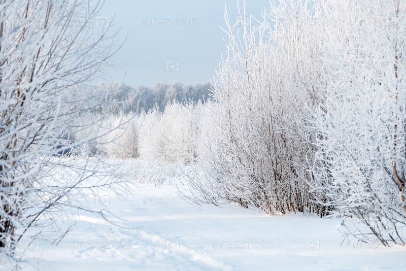 Тропинка в сугробе среди рядов кустов, покрытых белым инеем