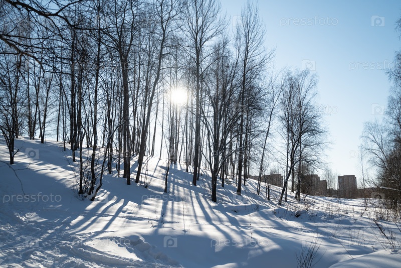 Заснеженный холм, поросший деревьями, сквозь которые сквозь зимний пейзаж пробивается солнечный свет. Длинные темные тени, отбрасываемые деревьями на снег