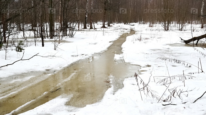 Талый снег и камешки с талой водой на дороге в лесу ранним весенним пейзажем