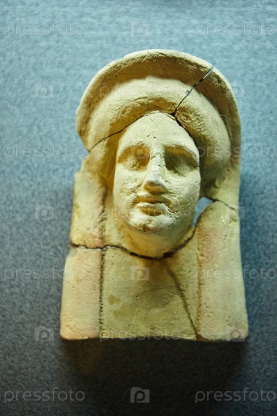 Тамань, Россия - 27 февраля 2019 г.: Древний античный барельеф лица человека. Искусство старых мастеров. Каменная статуя