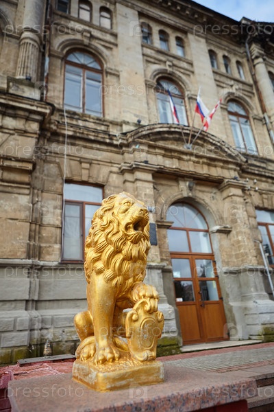 Бронзовая статуя льва в старом здании. Искусство старых мастеров