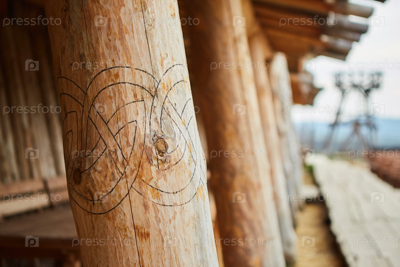 Симферополь, Крым - 3 мая 2019 г.: Деревянные столбы с резьбой в музее этнической деревни. Декорации к фильмам о викингах