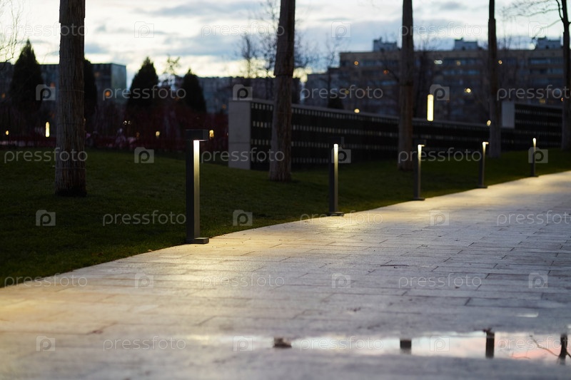 Городская улица или аллея в парке в сумерках. Ночное освещение в городе