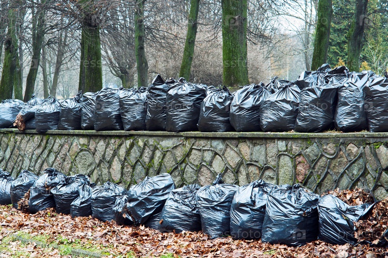 Черные мешки для мусора возле забора, мешки с опавшими листьями