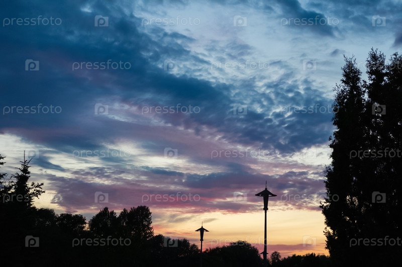 Закатное вечернее небо с синими и розовыми облаками, деревья и столбы с негорящими уличными фонарями