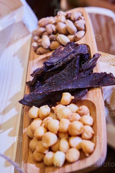 Ассортимент из большого количества различных деликатесов. Сыры, колбасы, консервы и хлеб, зелень и соусы