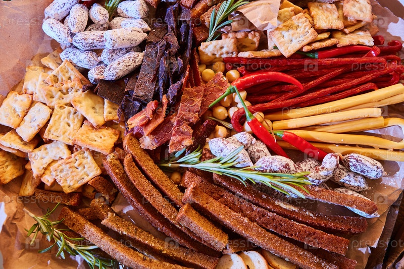 Ассортимент из большого количества различных деликатесов. Сыры, колбасы, консервы и хлеб, зелень и соусы