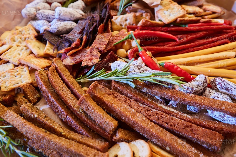 Ассортимент из большого количества различных деликатесов. Сыры, колбасы, консервы и хлеб, зелень и соусы