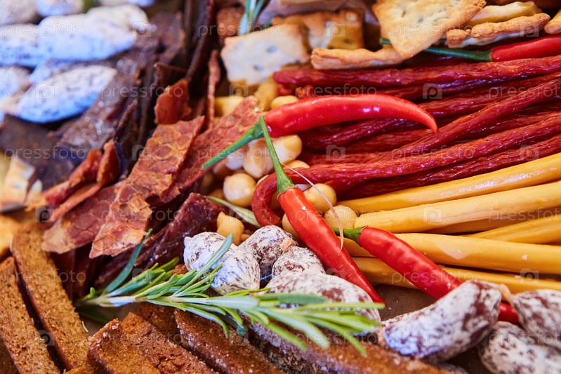 Ассортимент из большого количества различных деликатесов. Сыры, колбасы, консервы и хлеб, зелень и соусы