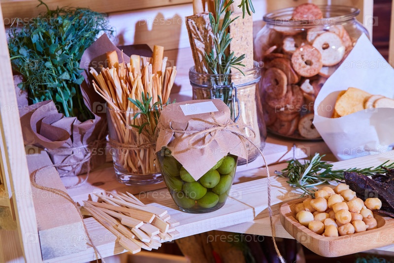 Ассортимент из большого количества различных деликатесов. Сыры, колбасы, консервы и хлеб, зелень и соусы