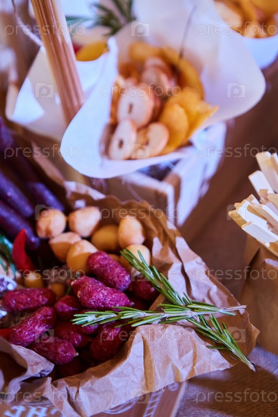 Ассортимент из большого количества различных деликатесов. Сыры, колбасы, консервы и хлеб, зелень и соусы