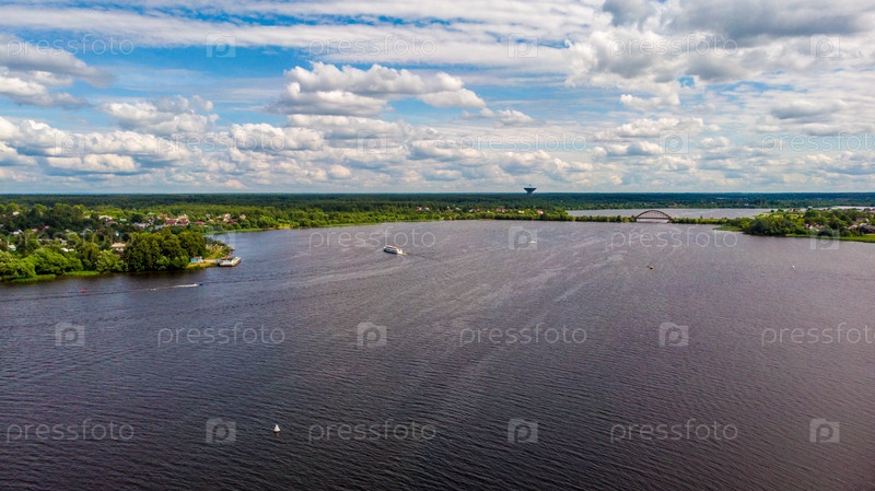 Затопленная колокольня горбатый мост и телеском достопримечательности Калязина на Волге