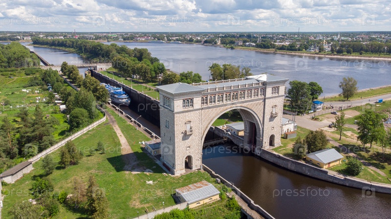 Круизный лайнер в судовом шлюзе Угличской ГЭС на Волге