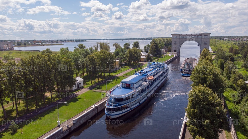 Круизный пароход в судовом шлюзе Угличской ГЭС на Волге