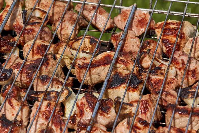 Мясо жарят над раскаленными углями в жаровне на решетке. На углях приготовят шашлык. Крупный план