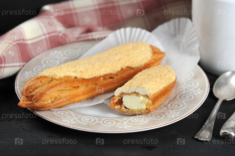 Торт Эклер целый и нарезанный на тарелке