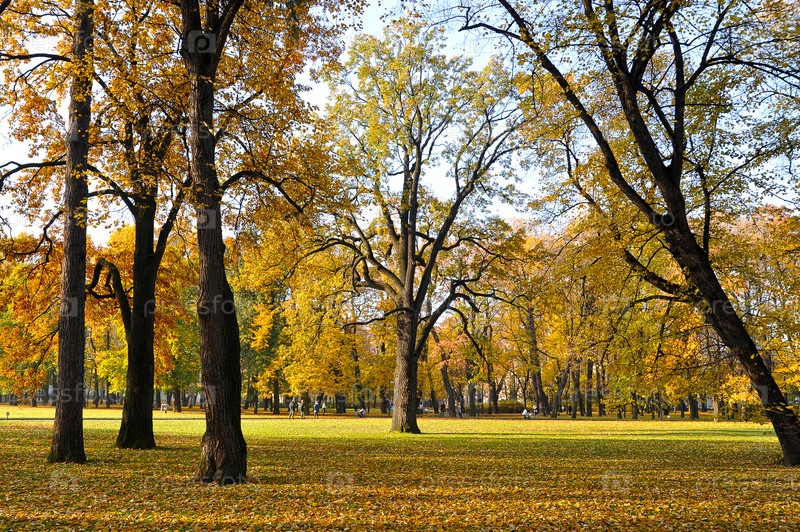 Осенний парк с желтыми листьями и опавшими листьями и чеширским дубом