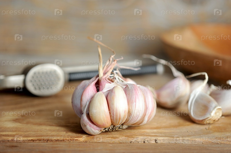 Головка чеснока и пресс для чеснока