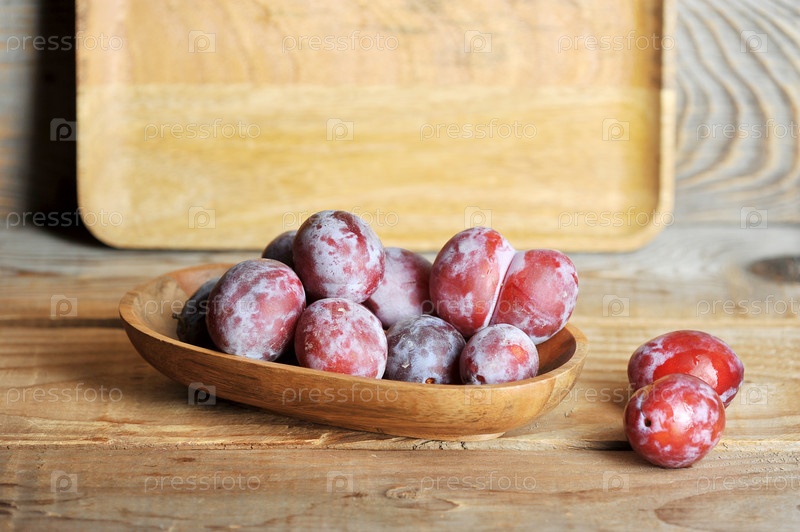Спелые сливы в деревянной тарелке на деревянном фоне