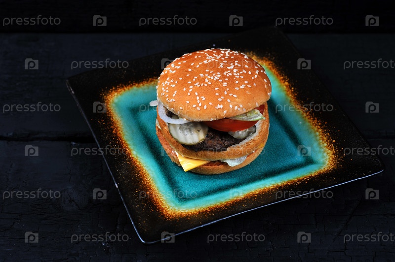 Фаст-фуд Бургер с сыром и говядиной на тарелке