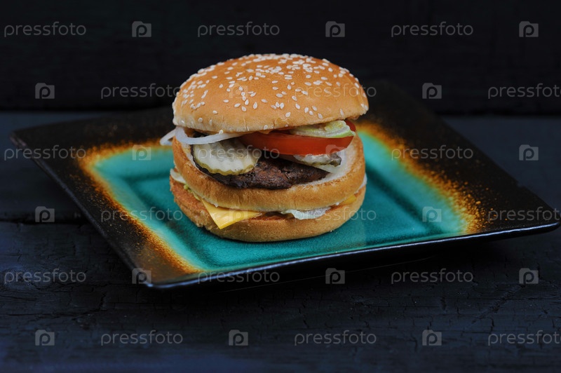Фаст-фуд Бургер с сыром и говядиной на тарелке