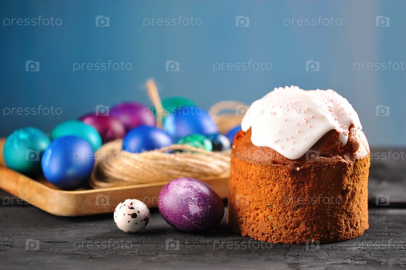 Пасхальный фон - праздничный кулич и крашеные яйца