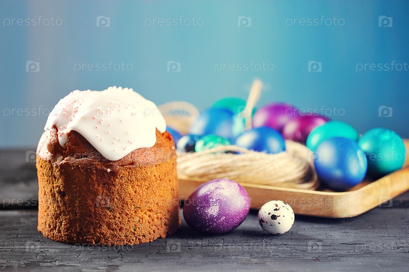 Пасхальный фон - праздничный кулич и крашеные яйца