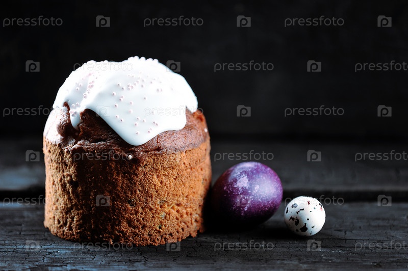 Пасхальный фон - праздничный кулич и крашеные яйца