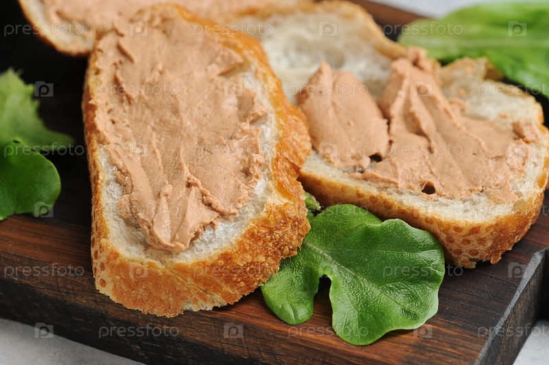 Паштет с хлебом и листьями салата на деревянной доске
