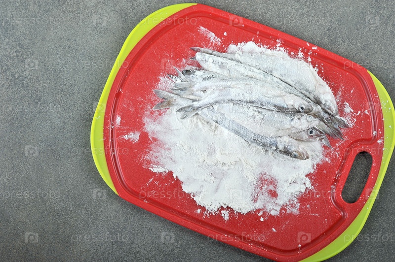 Корюшка, обваленная в муке и готовая к жарке на красной доске