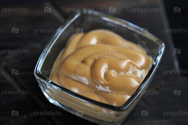 Горчица в стеклянной посуде на темном деревянном фоне