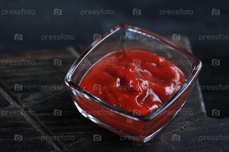 Кетчуп в стеклянной посуде на темном деревянном фоне