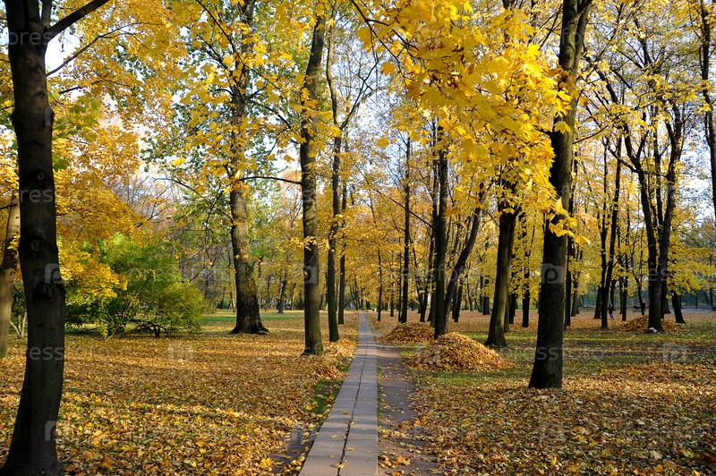 Осенний пейзаж - парк с опавшими листьями и кучами
