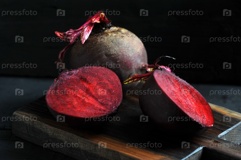 Разрезанная пополам свекла на деревянной доске